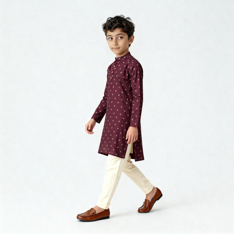 Elevate your young one's wardrobe with our Boys Printed Kurta with Pant Set, crafted from a soft and breathable viscose polyester blend. This stylish ensemble features a vibrant printed design, perfect for festive occasions or family gatherings.