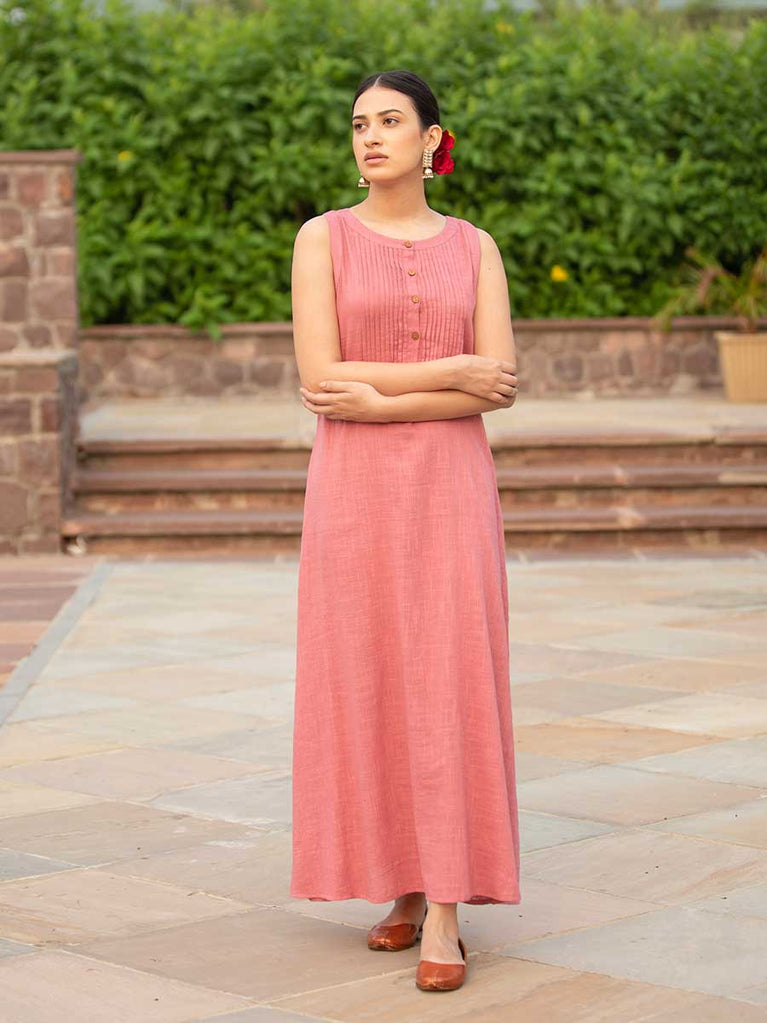 Salmon Pink Sleeveless Cotton Pintuck Dress