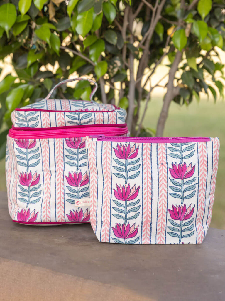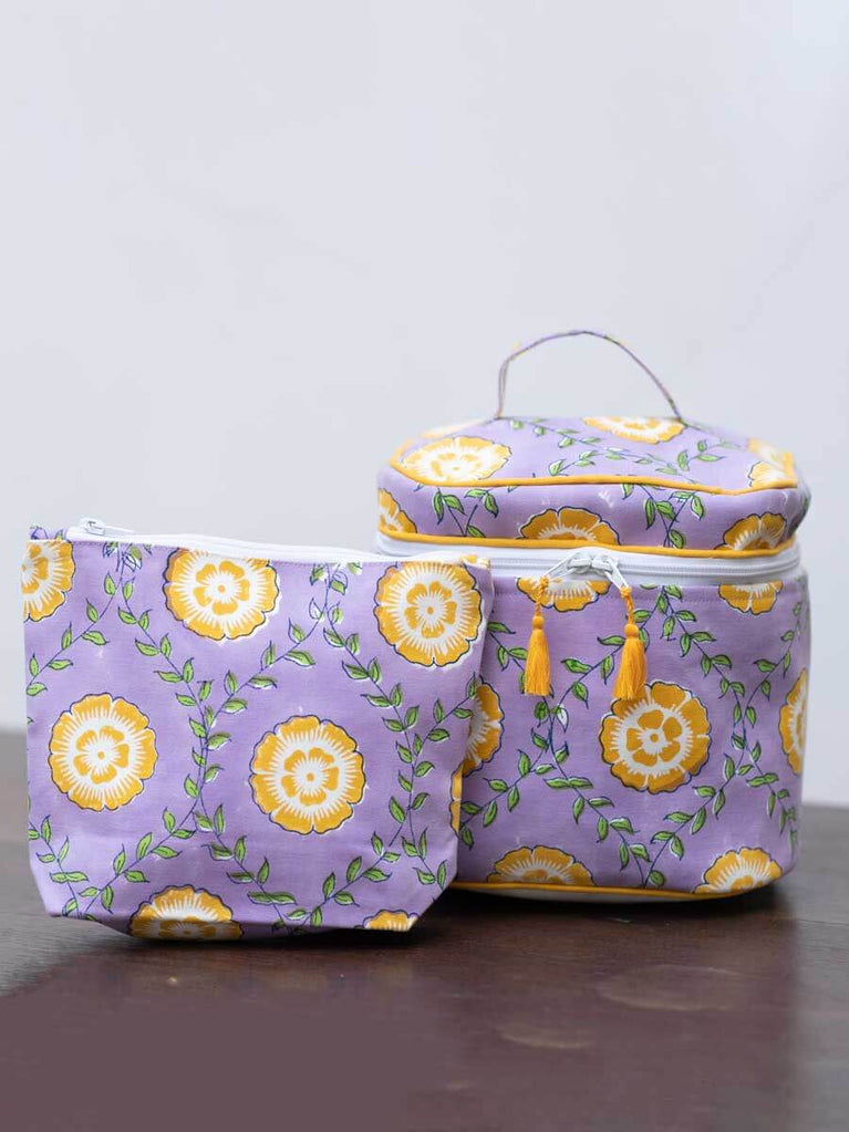 Set of 2 - Lotus Love Block Printed Vanity Case and Travel Pouch