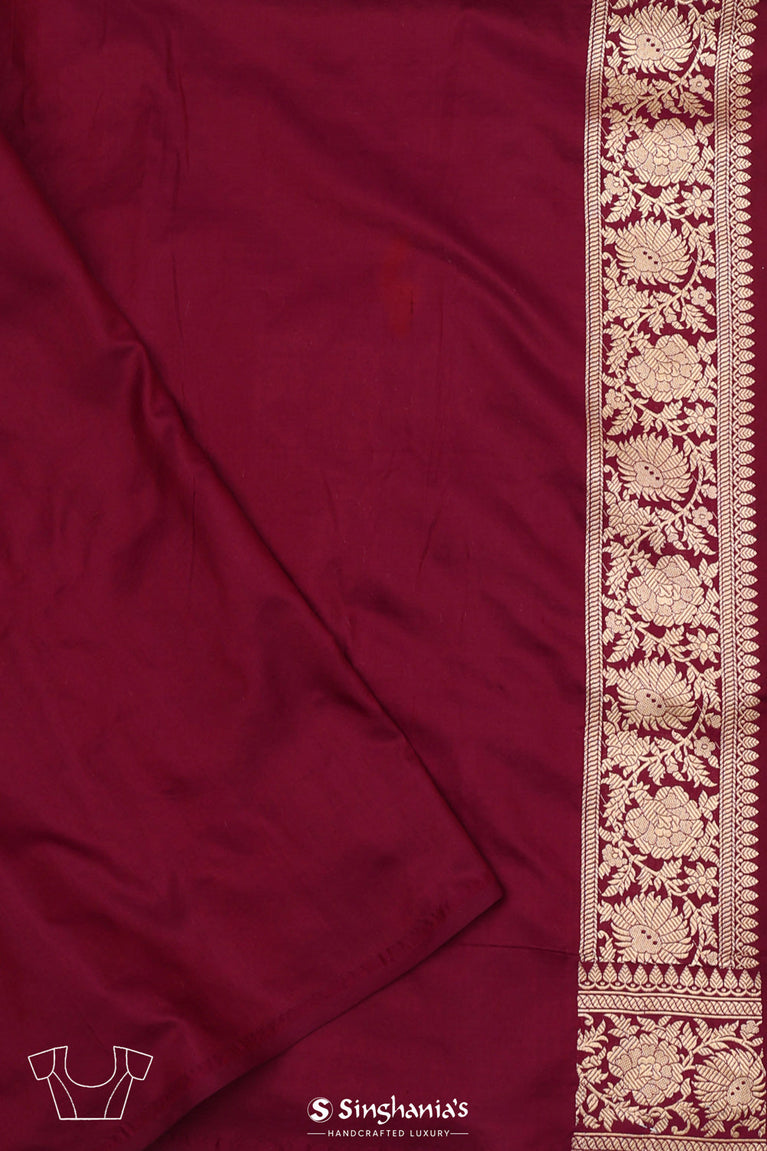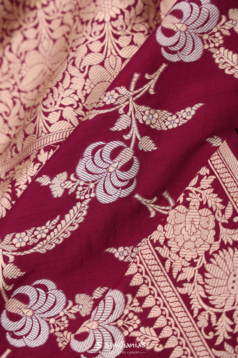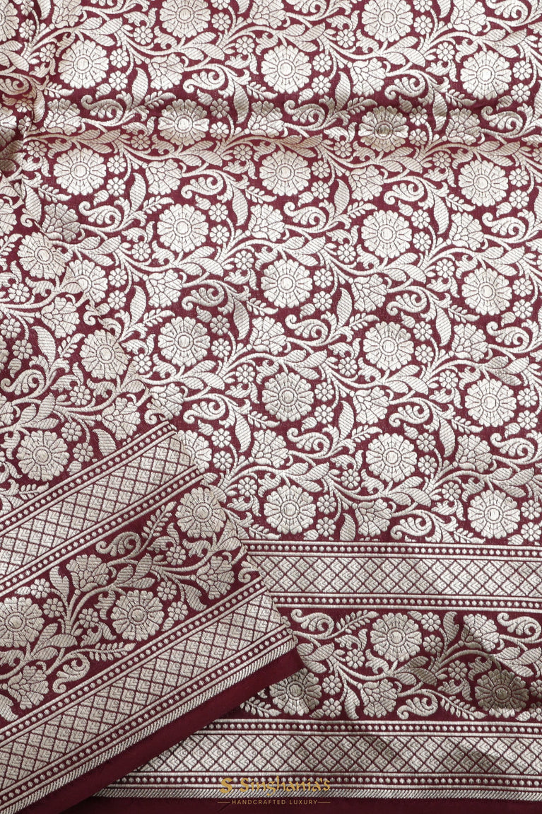 This is a deep maroon banarasi silk saree for festive, wedding occasions and party wear. Adorned with gold & silver zari floral jaal all over the body and a small floral border, completing the whole look.