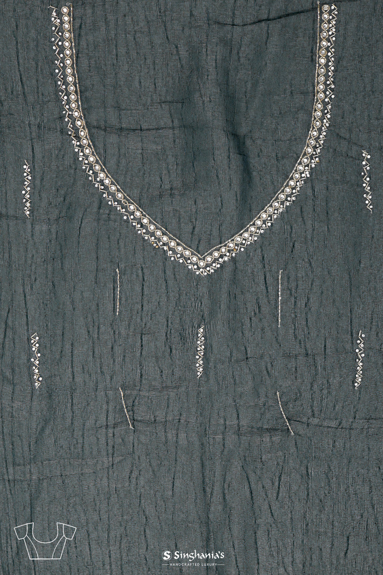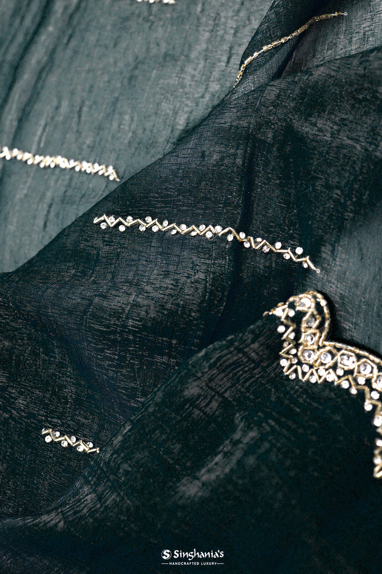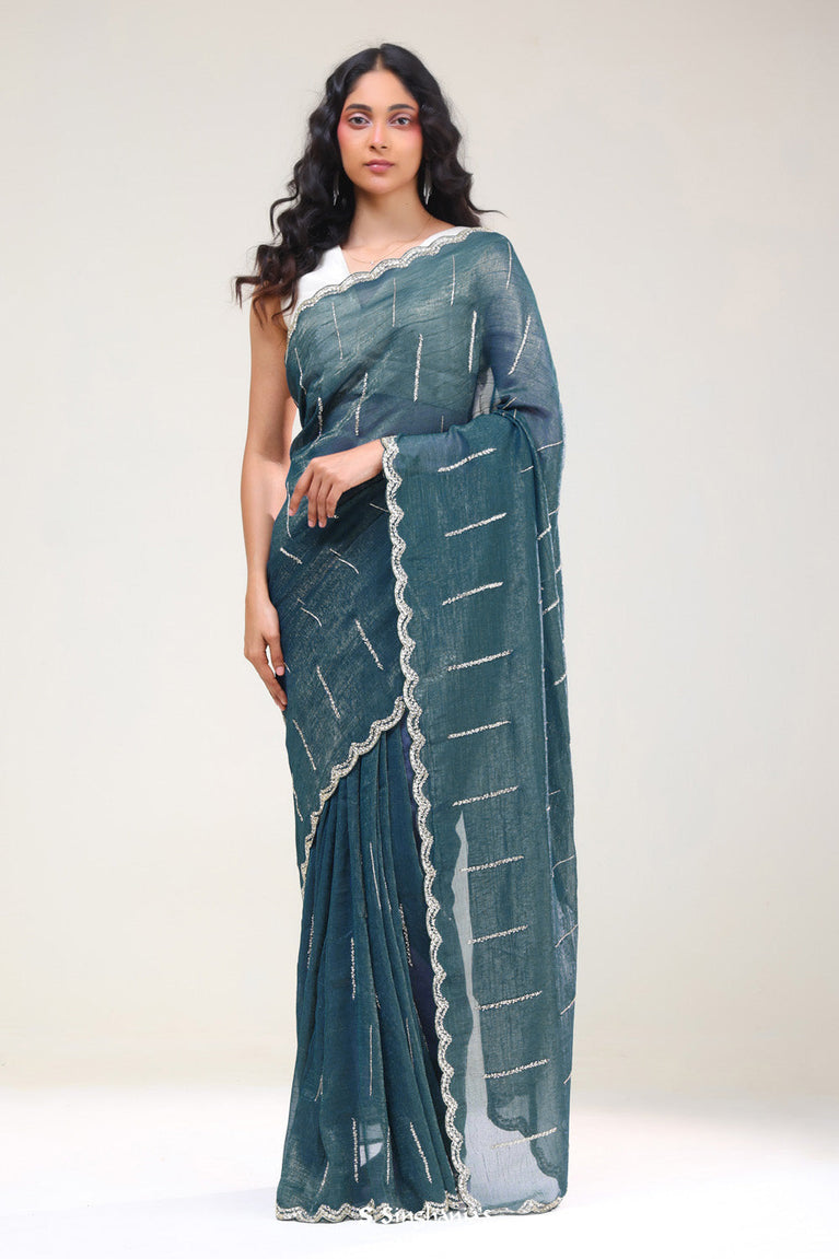 A saree that glows as beautifully as you do! This dark teal saree is woven with tissue fabric, creating a rich, radiant shimmer. Accentuated with glass beads and stones embroidery, it’s an excellent choice for festivals, receptions and grand celebrations.