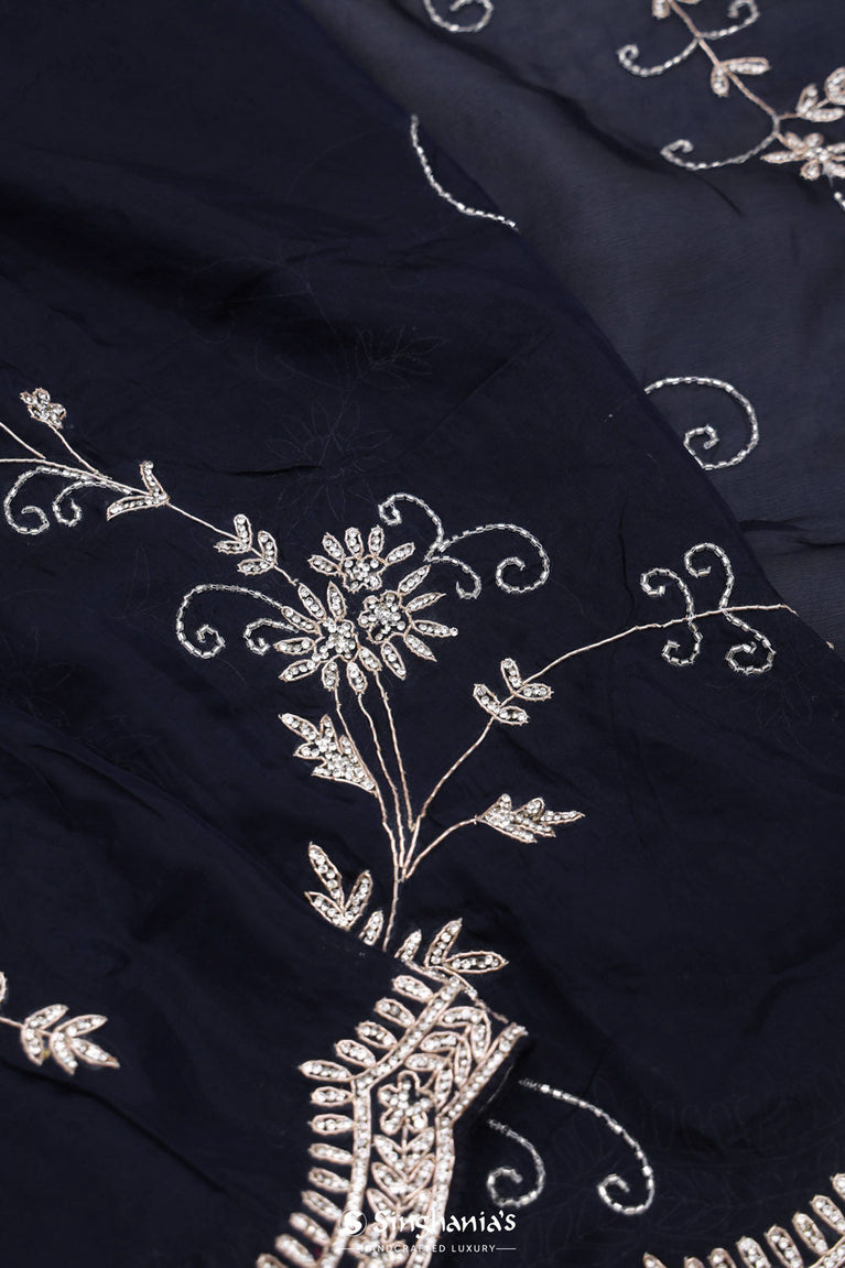 This richly deep blue organza saree is ideal for festive and casual celebrations. The intricate floral jaali embroidery all over, which are enhanced by a small floral, scalloped edged embroidery border in sequins and glass beads, creating a luxurious look.