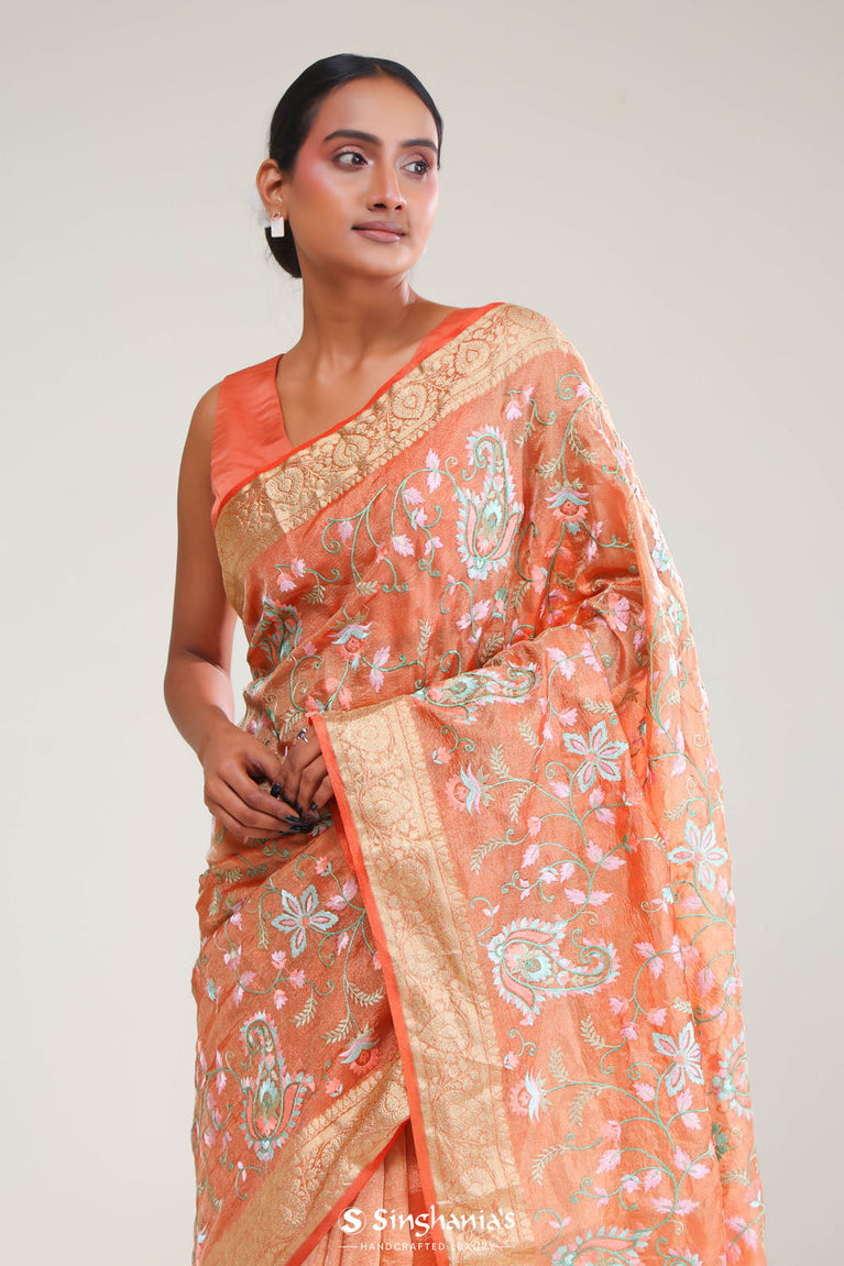 Deep Peach Banarasi Tussar Saree With Floral Jaal