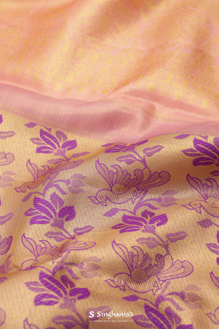 Exquisitely handwoven, this Golden Pink Tissue Kanjivaram Silk Saree features an ornate gold-tilfi zari floral peacock in jaal design and contrasting big border designed with with floral and kaddi pattern.