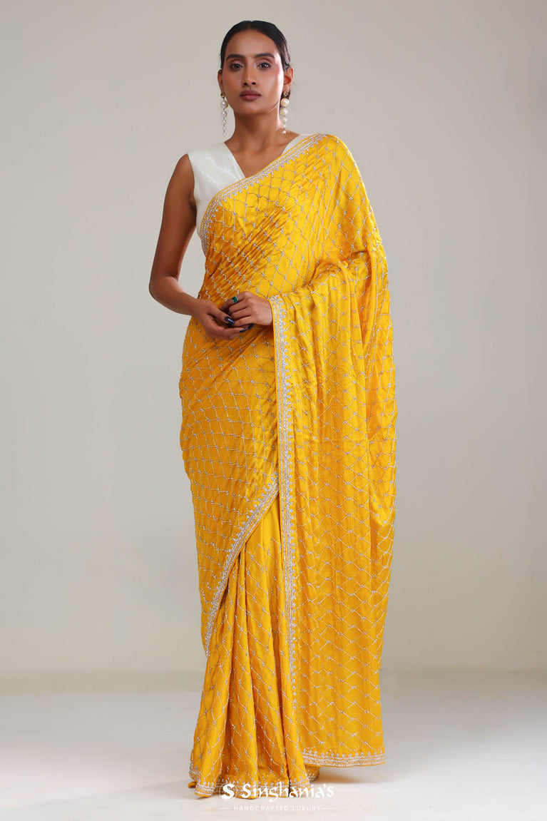 A beautiful gold yellow saree with a silk base, which features jaali embroidered pattern. Added with intricately embroidered border and pallu, crafted with stones and glass beads. It’s an excellent choice for festivals, receptions and grand celebrations.