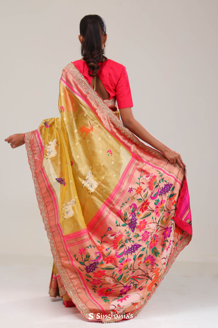 Gold Yellow Designer Tissue Saree With Paithani Border