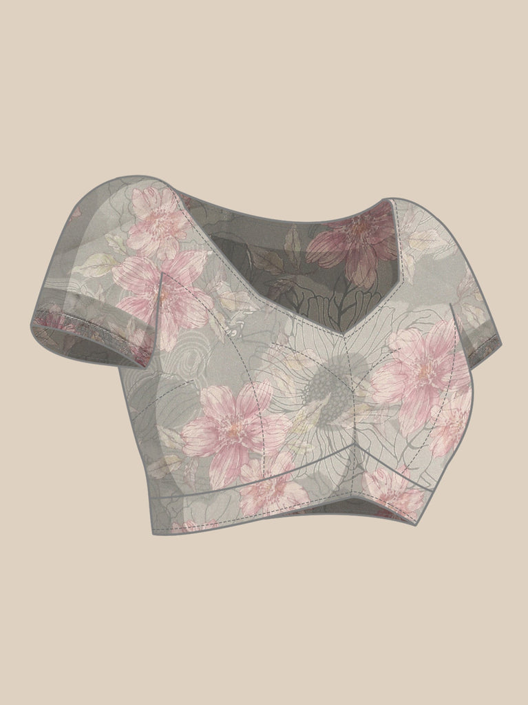 The saree is accompanied by a stylish, ready-made blouse designed to complete your look.