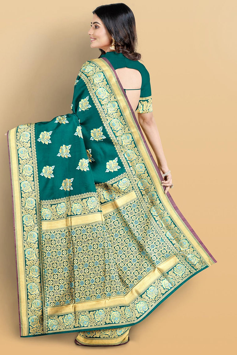 RAMA GREEN and MAGENTA FLORAL JAAL SILK BLEND Saree with SEMI PATTU