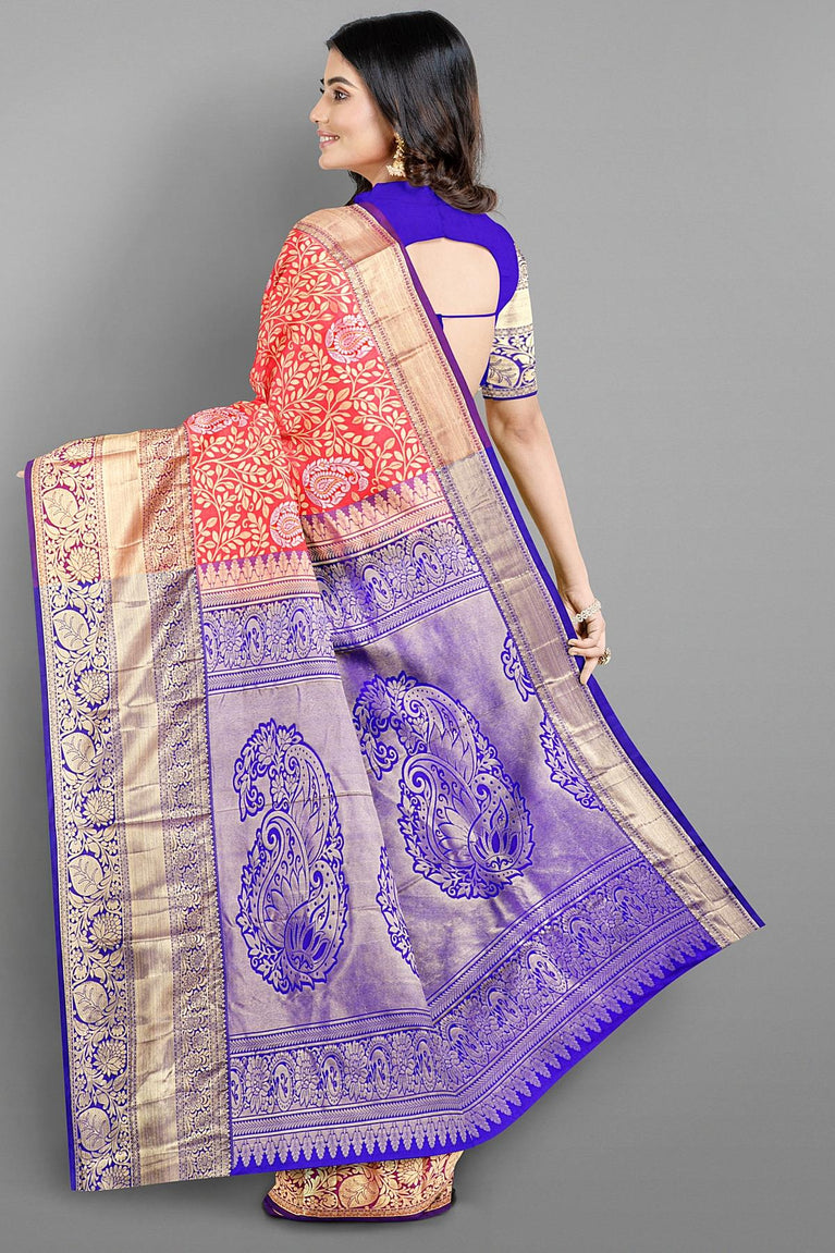 PEACH and ROYAL BLUE FLORAL JAAL SILK BLEND Saree with SEMI PATTU