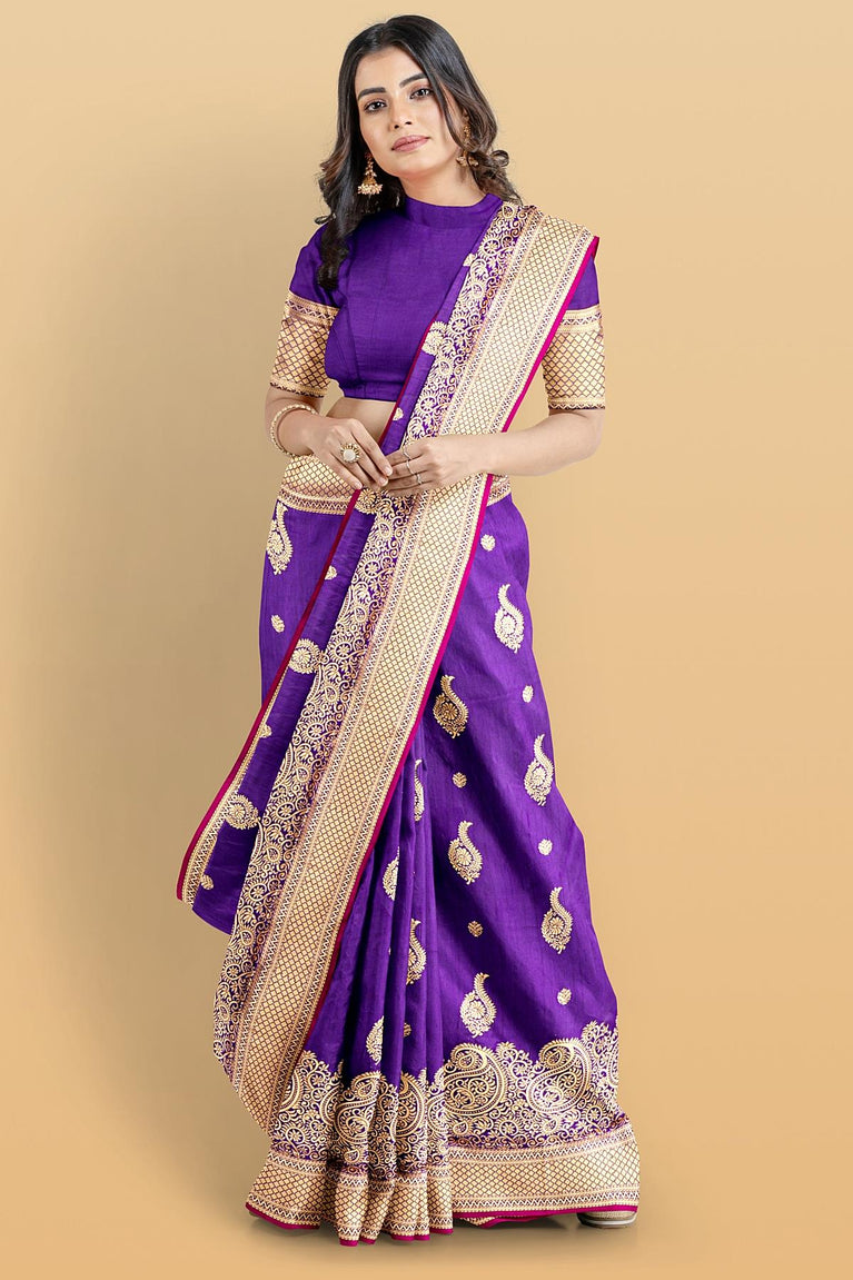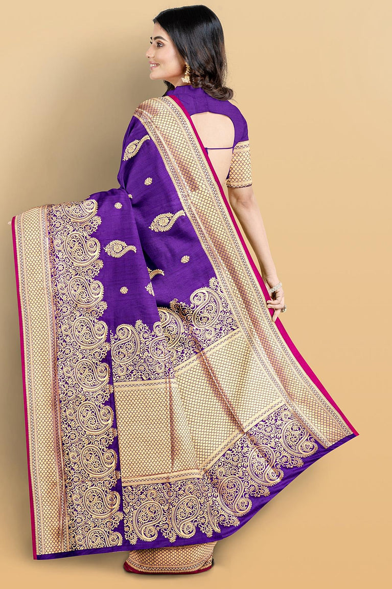 RED and VIOLET CHECKS AND BUTTIS VISCOSE Saree with BANARASI FANCY