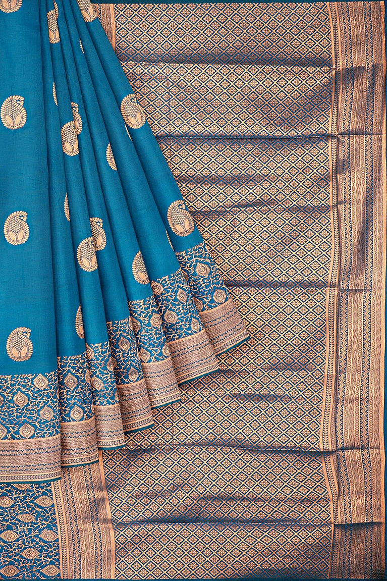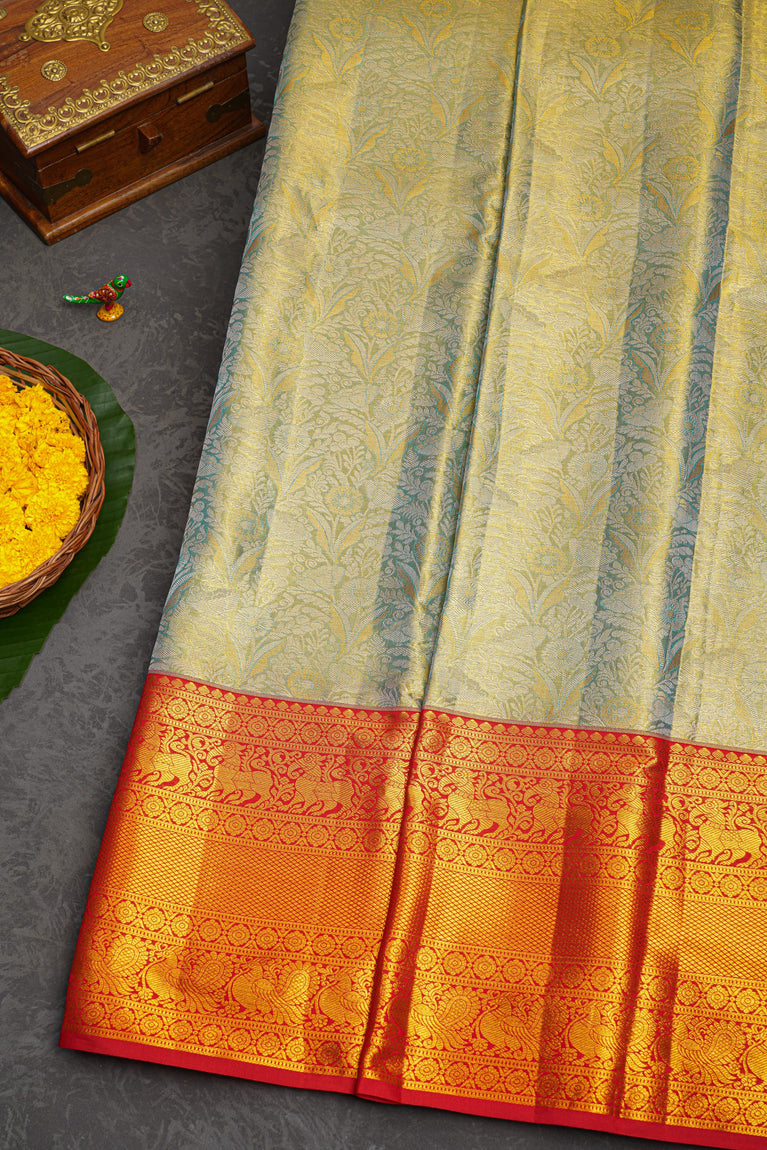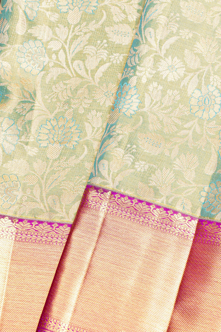 SEA BLUE and GOLD FLORAL JAAL SILK Saree with KANCHIPURAM