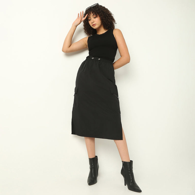 Experience the perfect blend of comfort and style with our Regular Fit Solid Calf Length Mid Rise Skirt. Crafted from 100% nylon, this skirt offers a smooth and lightweight feel, making it an ideal choice for any occasion. Its solid pattern and mid-rise waist provide a versatile look that can easily transition from day to night.