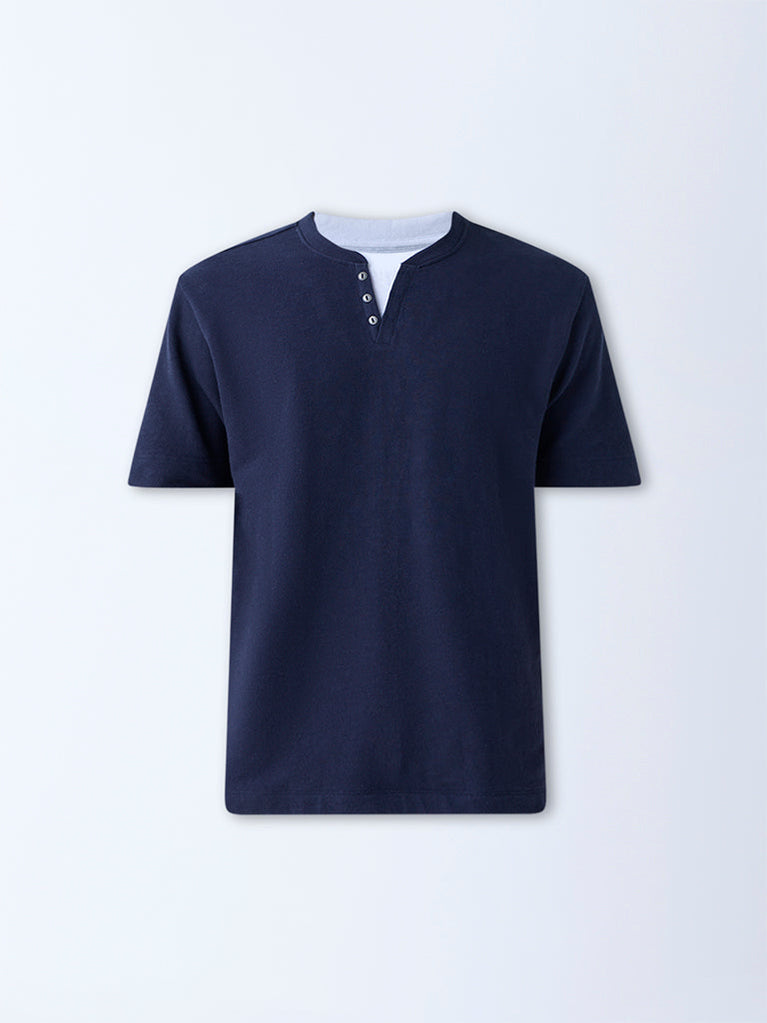 This navy t-shirt from ETA is constructed from a cotton-rich fabric in a relaxed silhouette for easy comfort. Styled with a round neck that merges into a V-cut with a three-button placket, it’s finished with half sleeves.