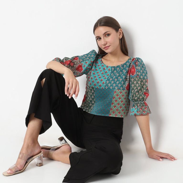 These abstract theme, boxy fit top has crop top length. Made from viscose, it is soft and comfortable to wear.