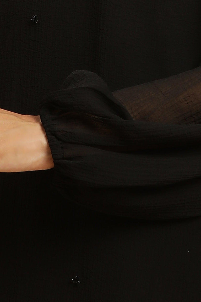 A Classic Black Rayon Shirt With Contrasting White Stitch Details. The Shirt Has Straight Silhuette And Full Sleeves.