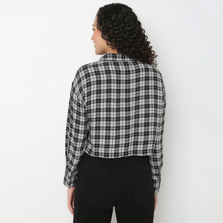 Checkered Lapel Collar Full Sleeve Crop T-Shirt