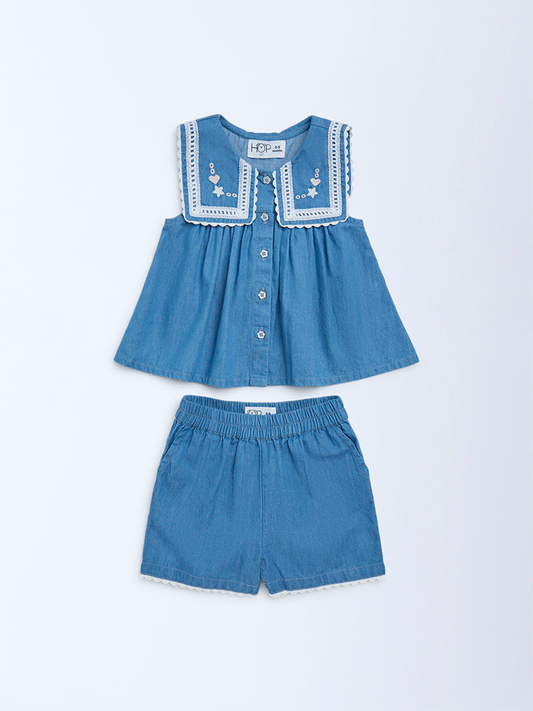 HOP Baby Girls Blue Embroidered Denim Top and Shorts Set