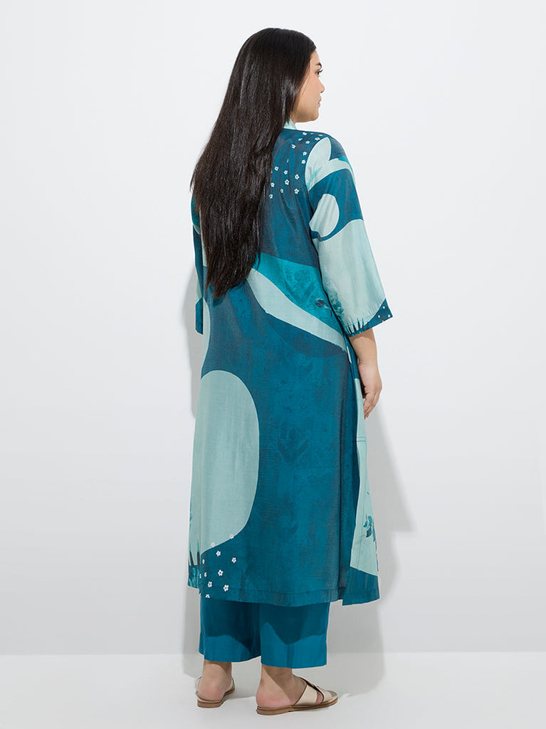 Defined with abstract prints, this teal kurta from Diza is sculpted in a flattering A-line silhouette. The lightweight fabric drapes effortlessly, while the asymmetrical neck and three-quarter sleeves add a modern touch. A discreet slip pocket enhances practicality, making this piece both stylish and functional.