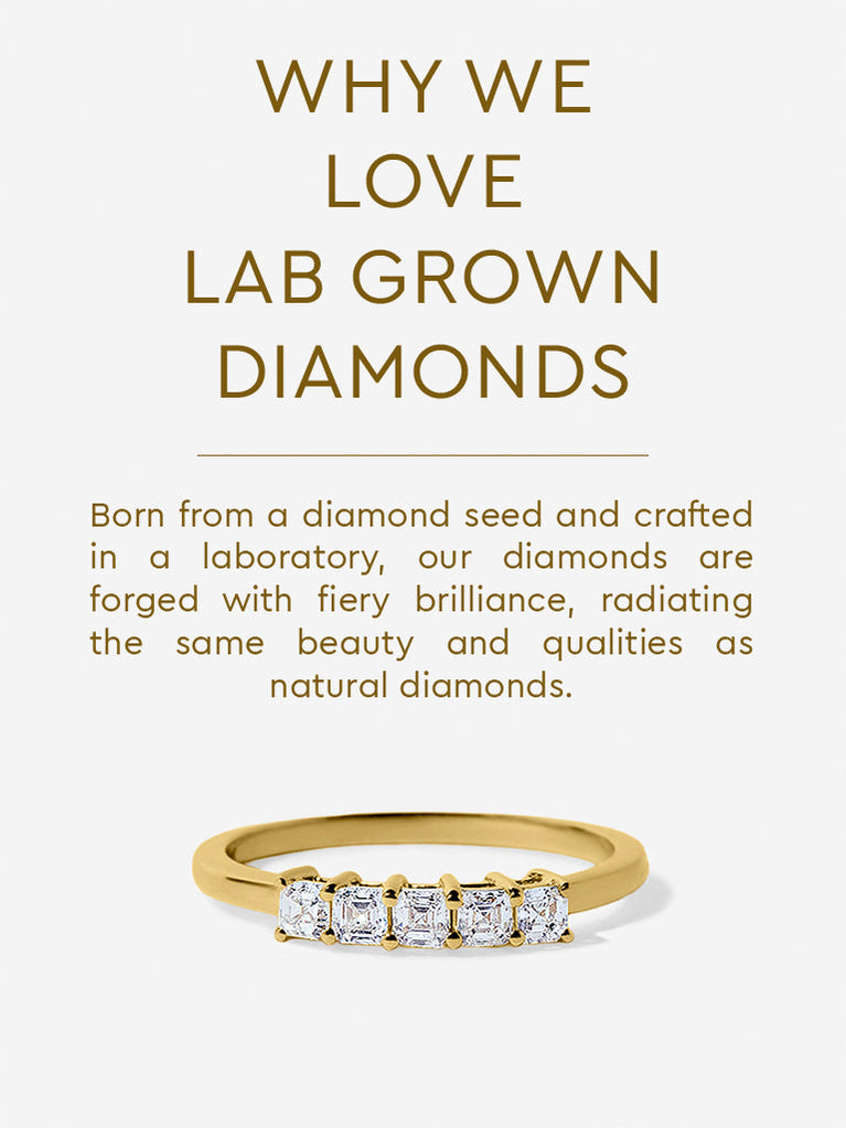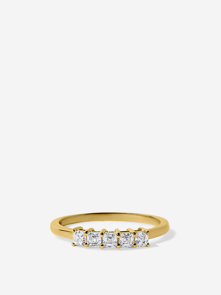 Celebrate a milestone with the enduring beauty of this Westside X Pome horizontal five-stone lab-grown diamond ring. Set on a polished gold band, the design showcases a radiant row of emerald-cut lab diamonds centered around a luminous solitaire, each secured with refined prongs to enhance their linear brilliance. Elegant and timeless, it makes a striking statement worn alone or paired seamlessly with an engagement ring.
