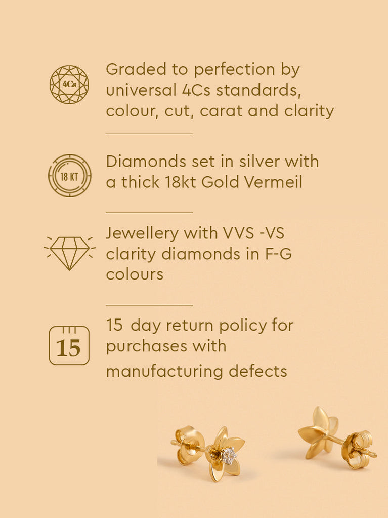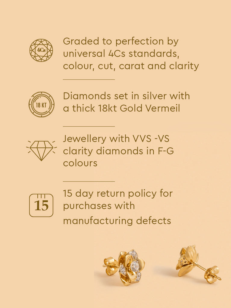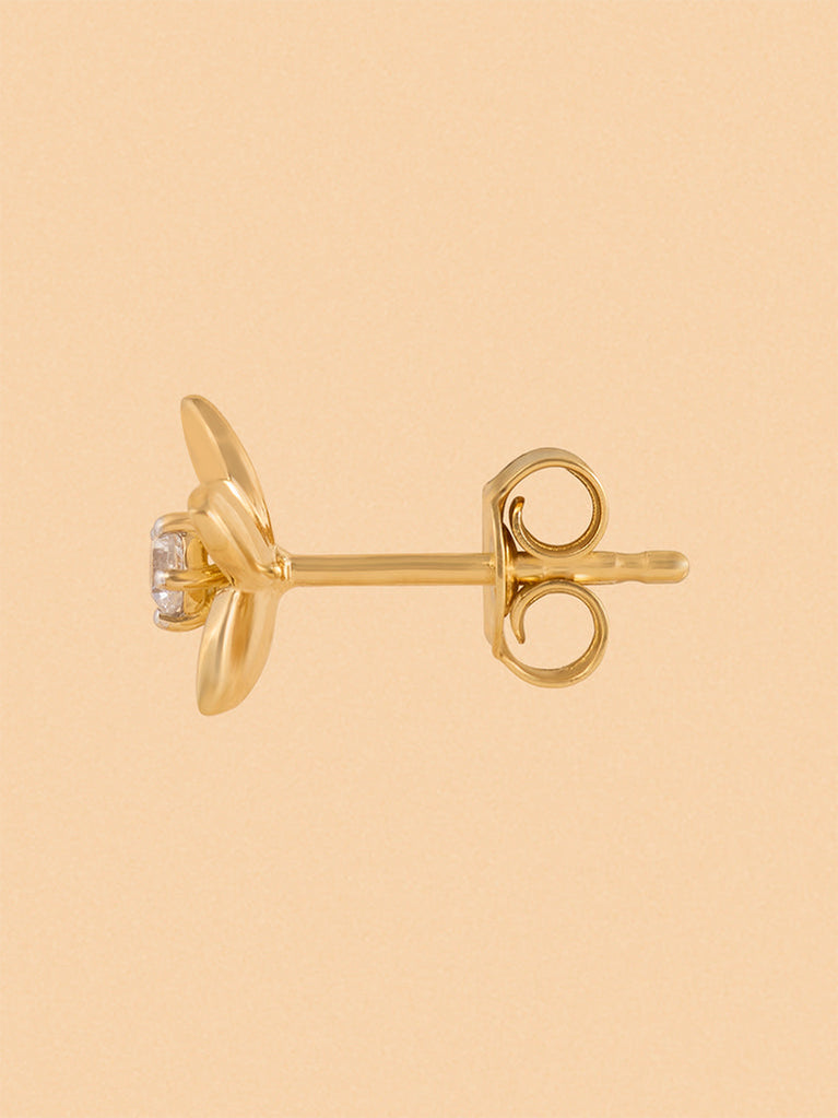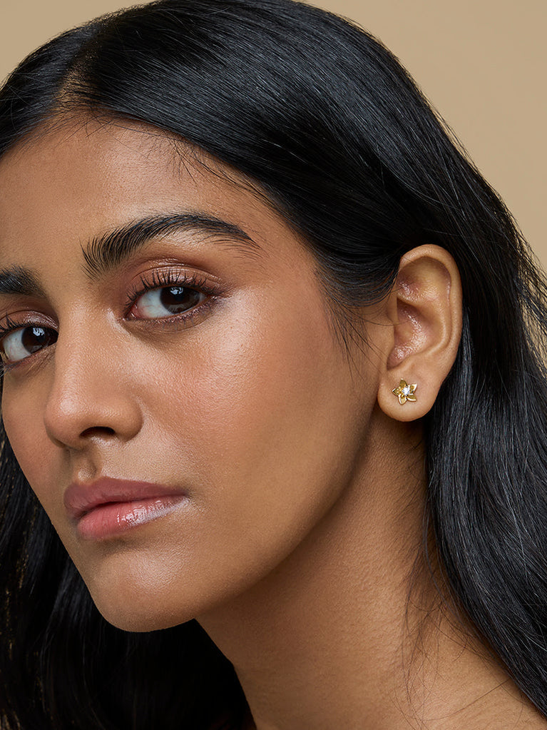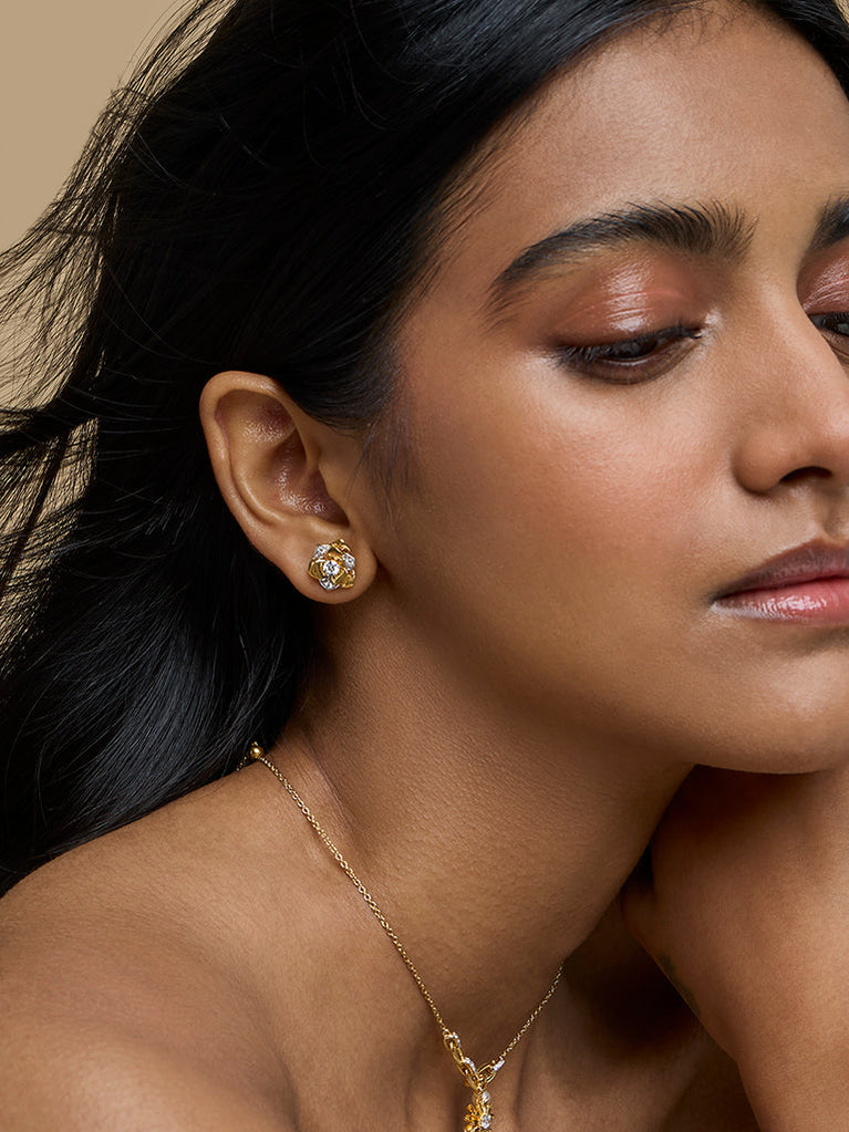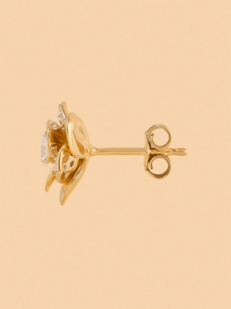 These gold-tone floral solitaire earrings from Westside X Pome are crafted with a polished finish. Each earring showcases a delicate floral motif centered around a single clear stone, designed in a petal-inspired silhouette. The post-back closure ensures a secure and comfortable fit, making this a timeless accessory.