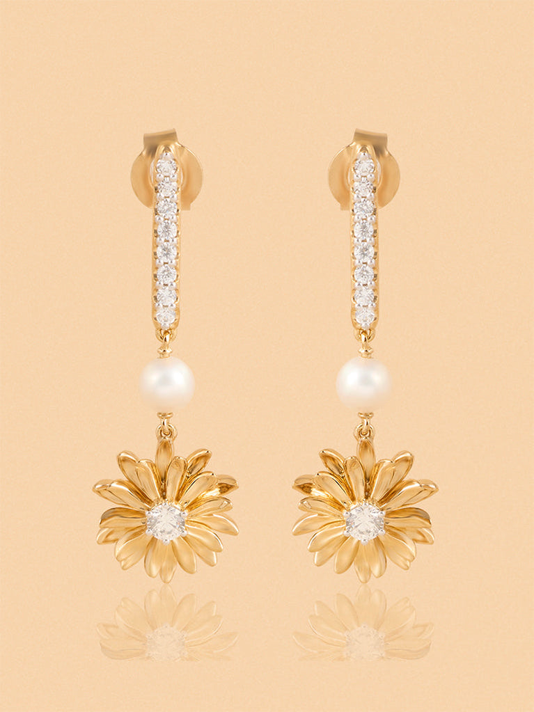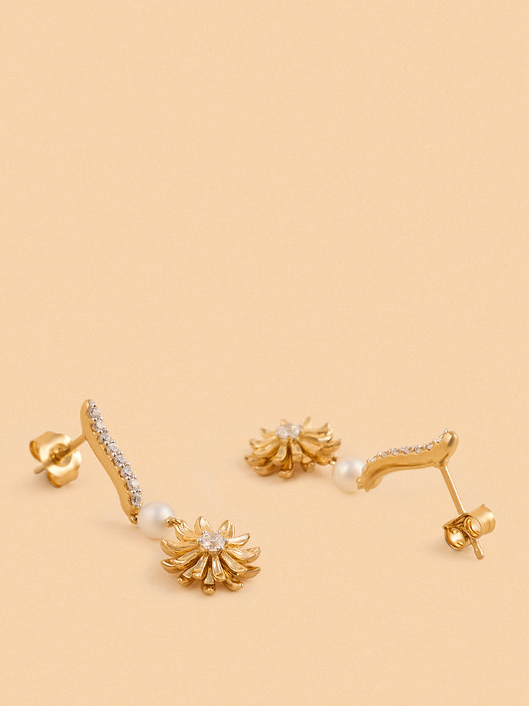 These drop earrings from Westside X Pome are crafted with a gold-tone finish, each earring showcases a dainty daisy with a sparkling clear stone at its center, followed by a pearl drop. A slender, curved gold-tone accent adorned with small clear stones extends from the daisy, adding a refined touch. Secured with a post-back closure, these earrings offer both elegance and comfort, making them a perfect choice for elevating any outfit.