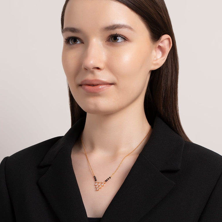 Kushal's Fashion Jewellery 92.5 Pure Silver MangalsutraOur top collection of mangalsutra will leave you spellbound. We have produced these necklaces with fine-quality zircon stones and 92.5 silver. You will feel the divine blessings enmeshed in the mangalsutra. Our mangalsutra comes with stunning gold polish. You can devise your conventional fashion with our mangalsutra collections.