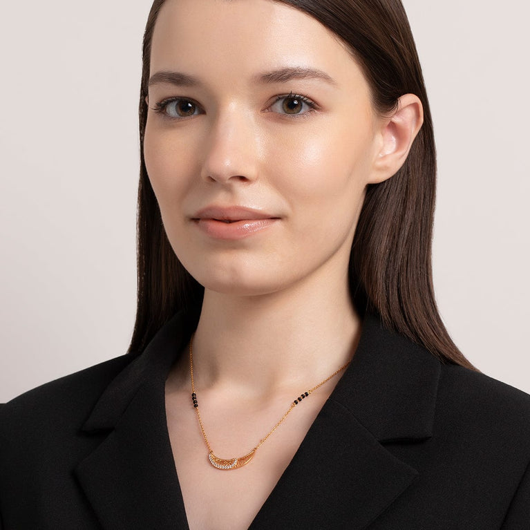 Kushal's Fashion Jewellery 92.5 Pure Silver MangalsutraThis crescent moon-shaped Mangalsutra can be the best addition to your everyday look. It has an adjustable chain and a 92.5 silver base. The premium gold polish and white stone embellishment add alluring beauty to this stunning jewellery. Adorn Kushal's jewellery's adjustable silver Mangalsutra to get a stylish and elegant look.
