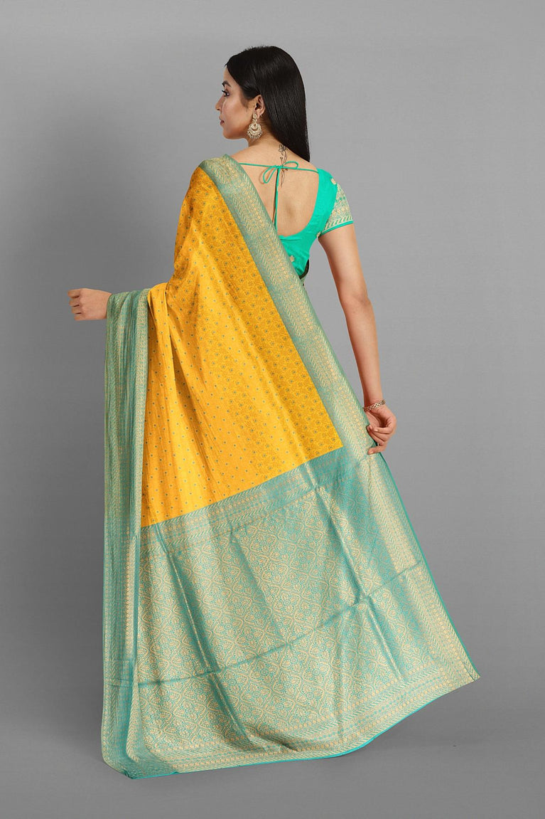 YELLOW and DARK GREEN BUTTIS VISCOSE SILK Saree with BANARASI FANCY
