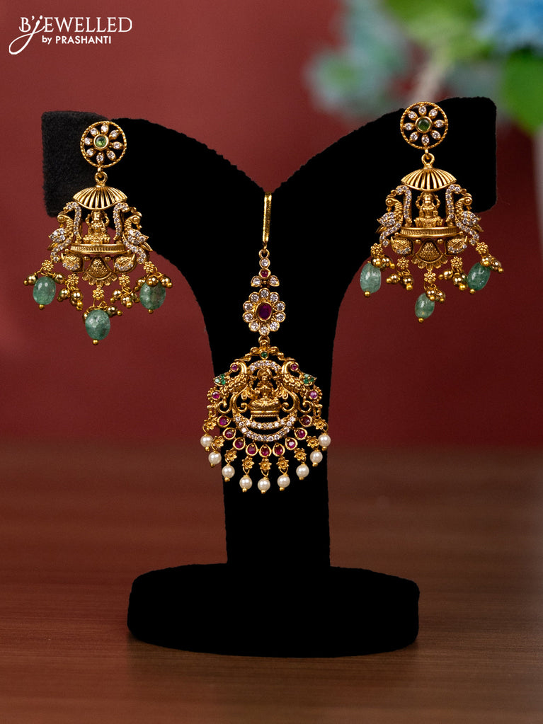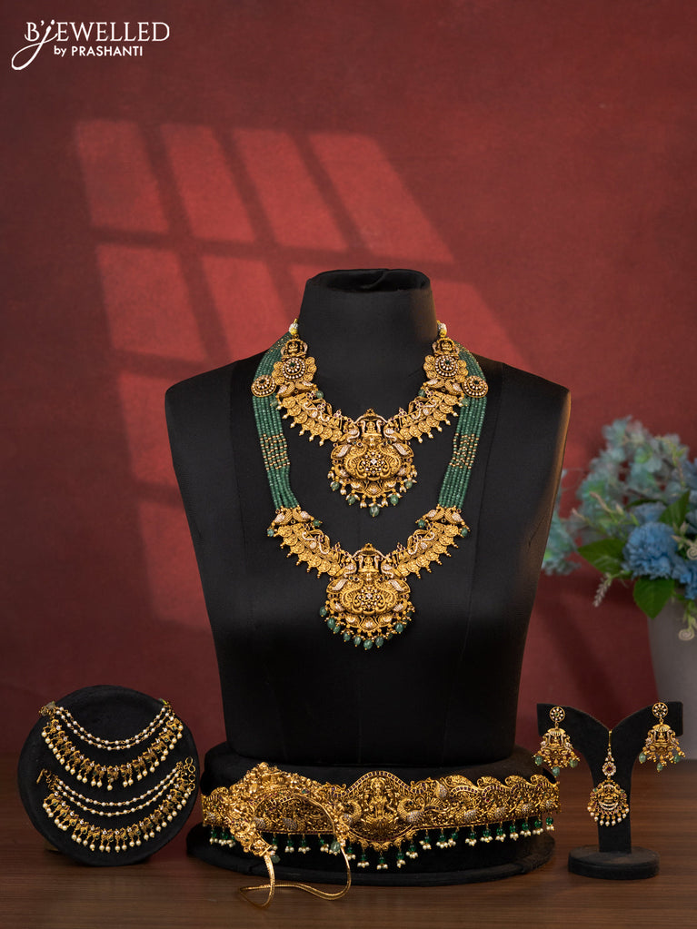 Antique bridal set lakshmi design with jadau cz stones and green beads hanging