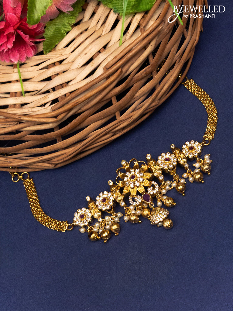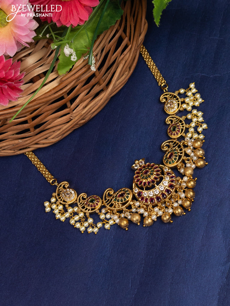 Antique choker chandbali design with kemp & cz stones golden beads and pearl hanging without earrings
