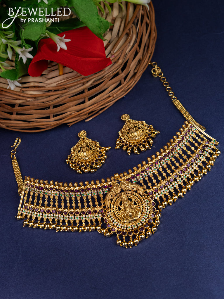 Antique choker lakshmi design with kemp & cz stones and golden beads hangings