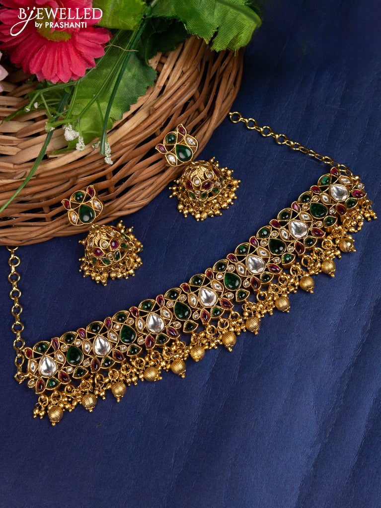 Antique choker with jadau kundan stones and pearl & green beads hanging