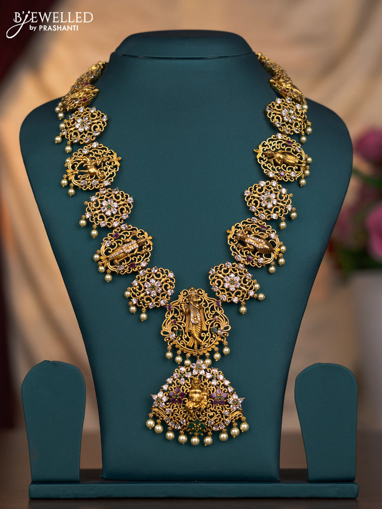 Antique dasavatar haaram with kemp & cz stones and pearl hangings