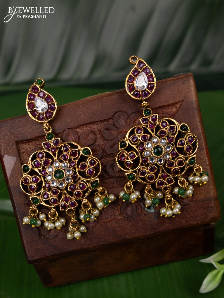 Antique earring manga pattern with kemp & kundan stones and pearl & green beads hanging