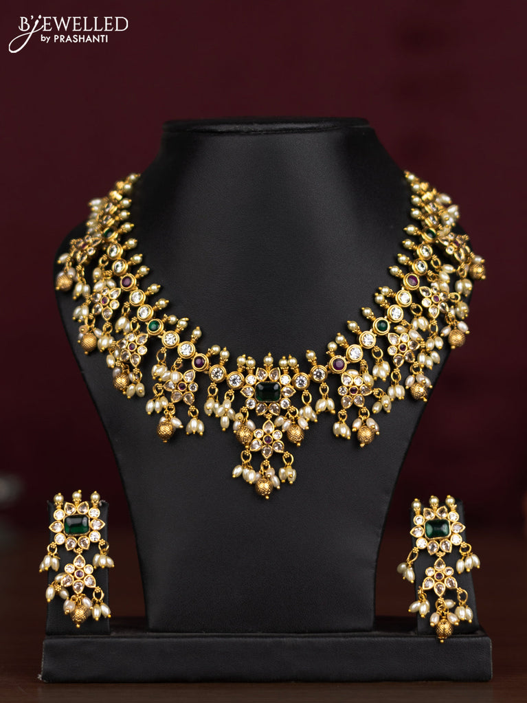 Antique guttapusalu necklace floral design with kemp & cz stones and pearl hangings