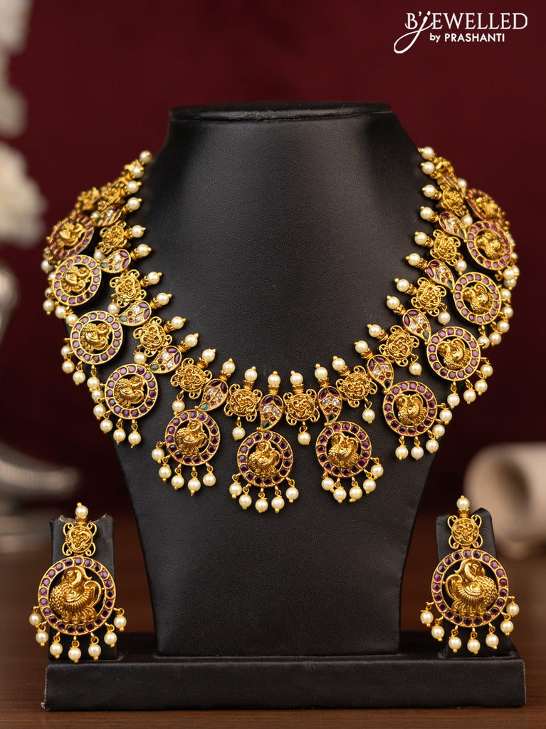 Antique guttapusalu necklace peacock & lakshmi design with kemp & cz stones and pearl hangings