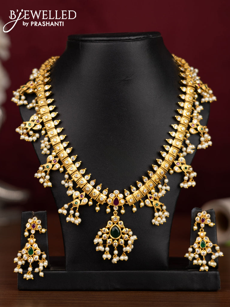 Antique haaram kemp & cz stones with lakshmi pendant and pearl hangings