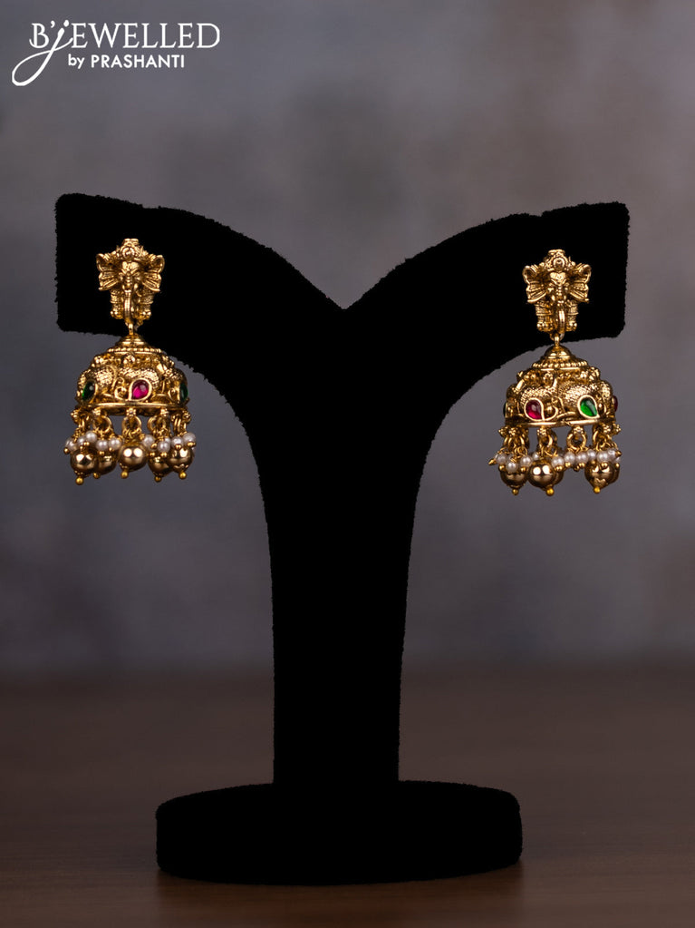 Antique haaram lakshmi & peacock design with pink kemp stones and golden beads hanging