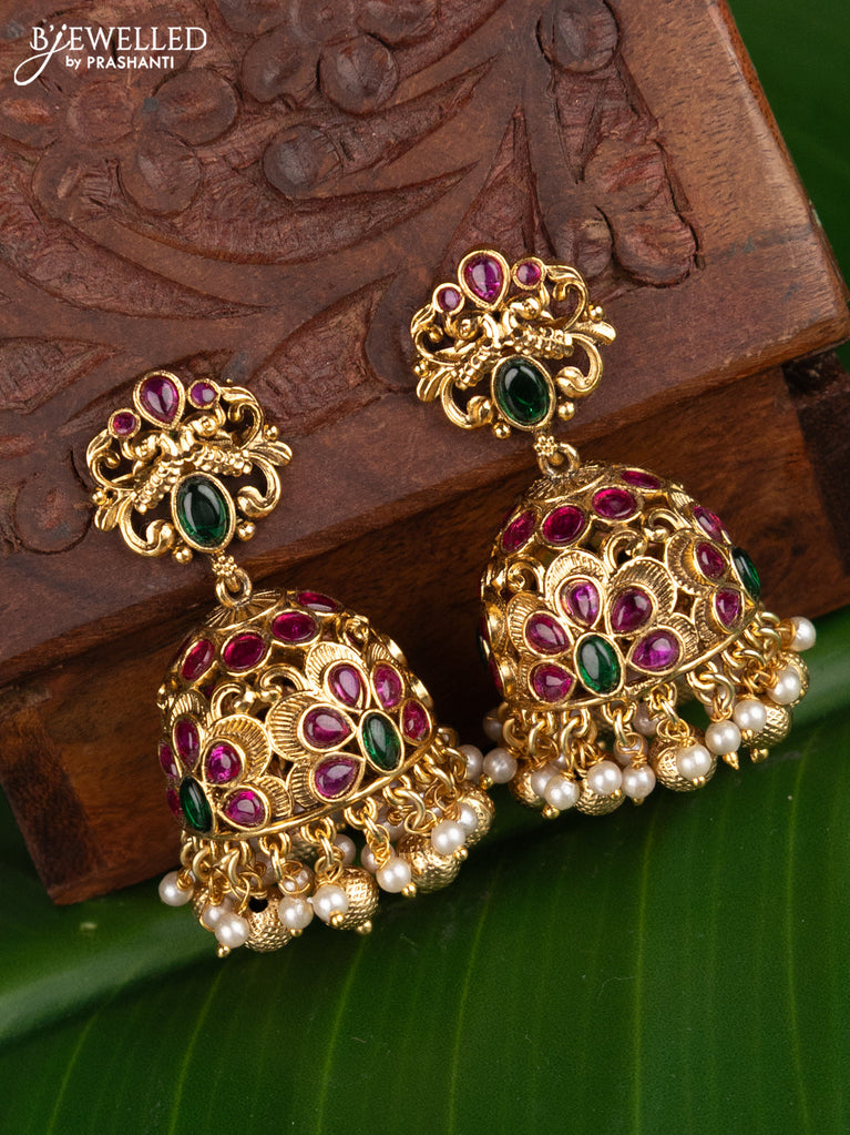 Antique jhumka peacock design with kemp stones and pearl hangings