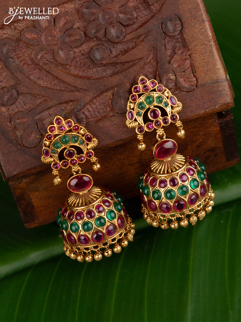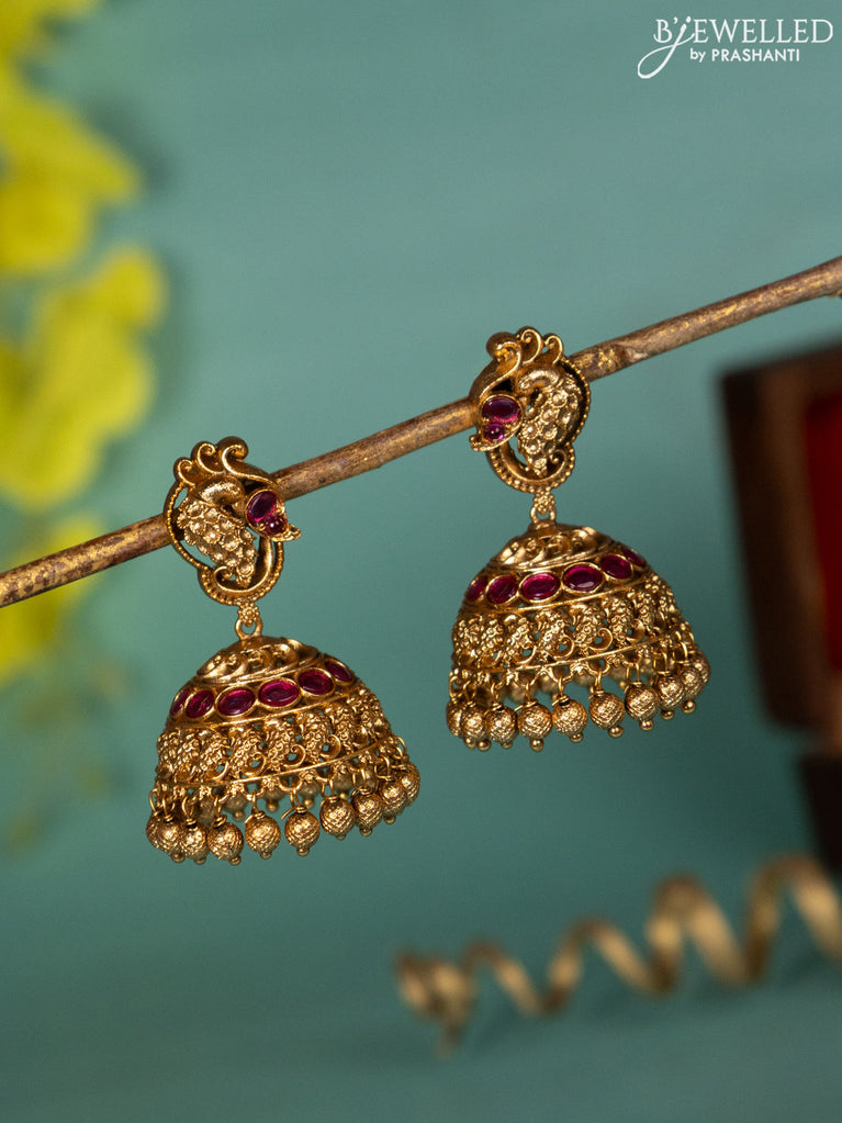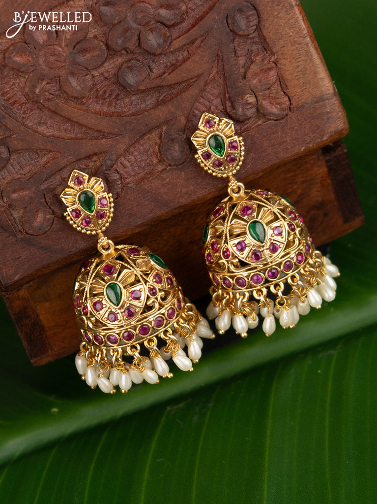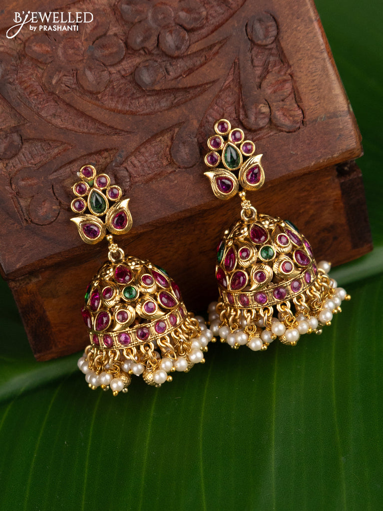 Antique jhumka with pink jadau kundan stones and pearl & beads hanging