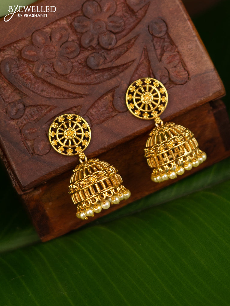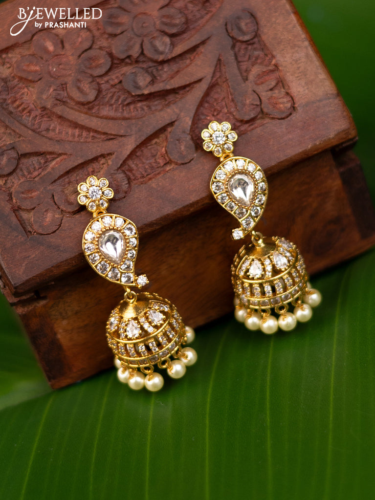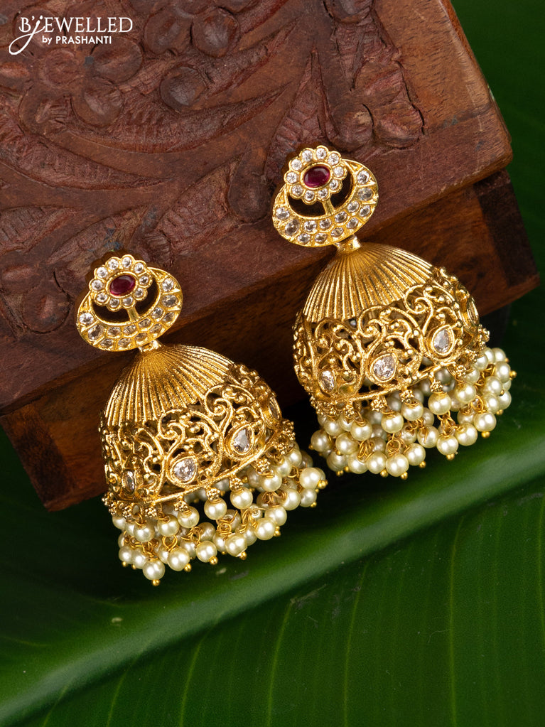 Antique jhumka with pink kemp & cz stones and pearl hangings