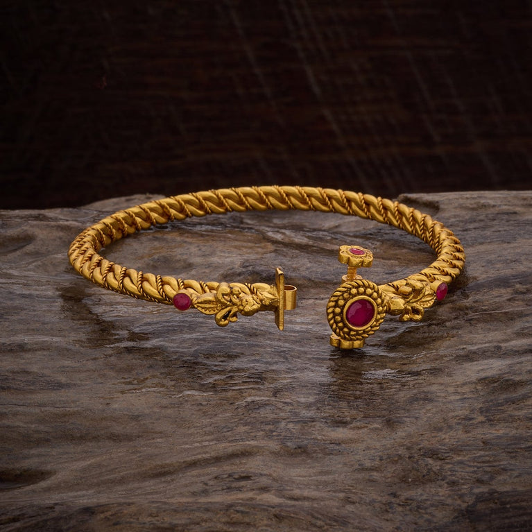 Kushal's Fashion Jewellery Flower Motif Antique KadaYou need a magnificent wrist accessory to blend in with your eye-catching necklaces and earrings, and our latest antique Kada is the perfect option. The ruby and ruby-green stones adorn the gold polish on this Kada, making it the best accessory for traditional and fancy occasions. Trust this Kada to be your source of confidence and praise.