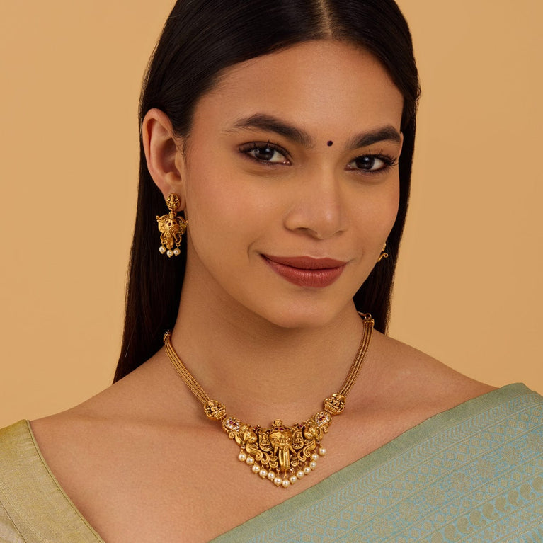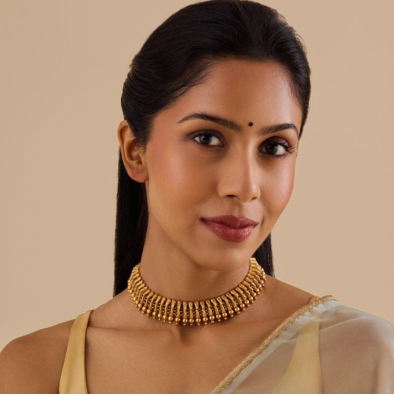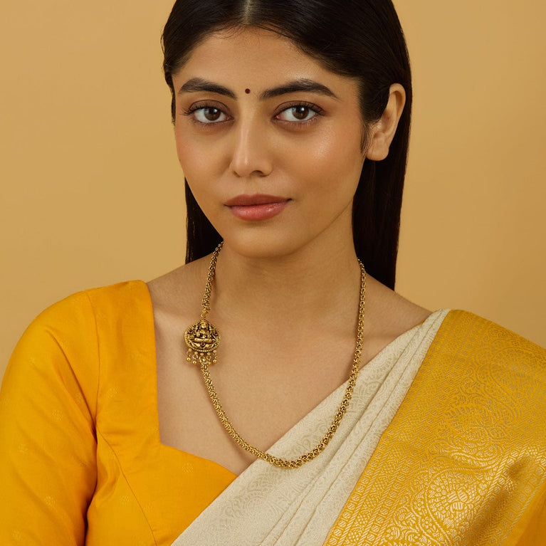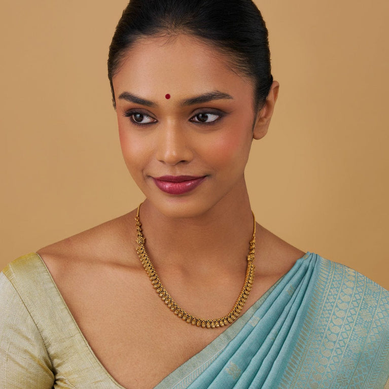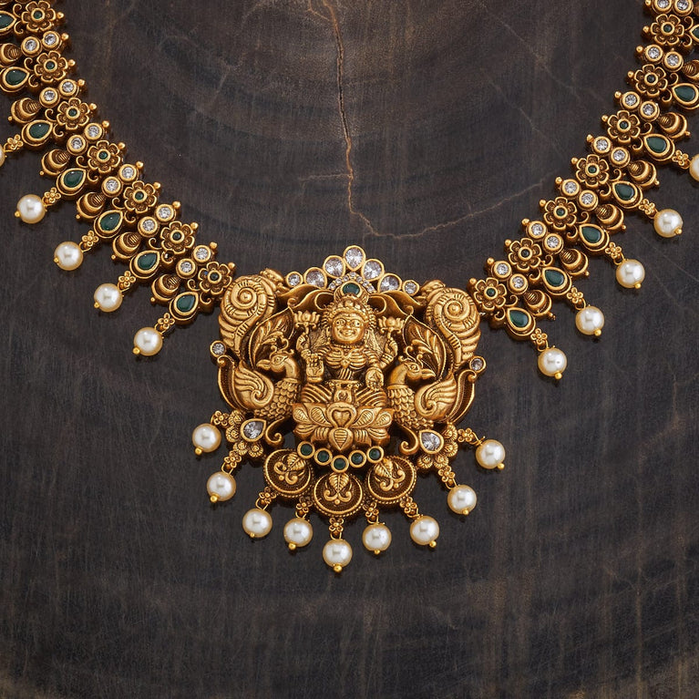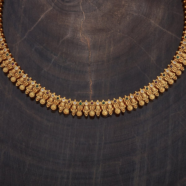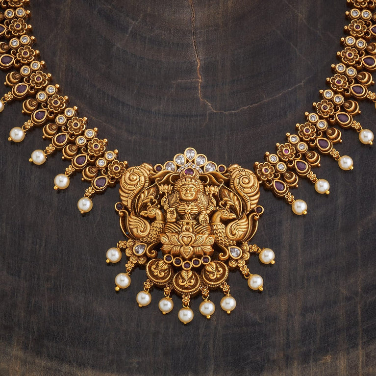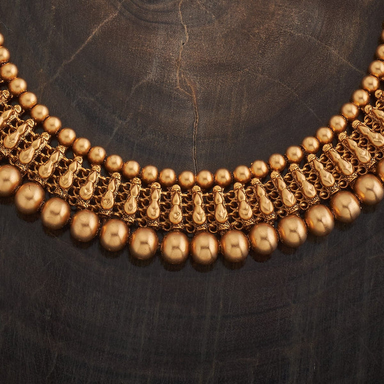 Kushal's Fashion Jewellery Antique NecklaceJewellery is the favorite element among women, boosting your looks and self-assurance. Antique jewellery has become a trend lately. Make your impression long-lasting with this ancient and classic piece of antique necklace. This piece is intricately designed, gold-polished and studded with ruby stones, demonstrating a masterpiece of the vintage era.