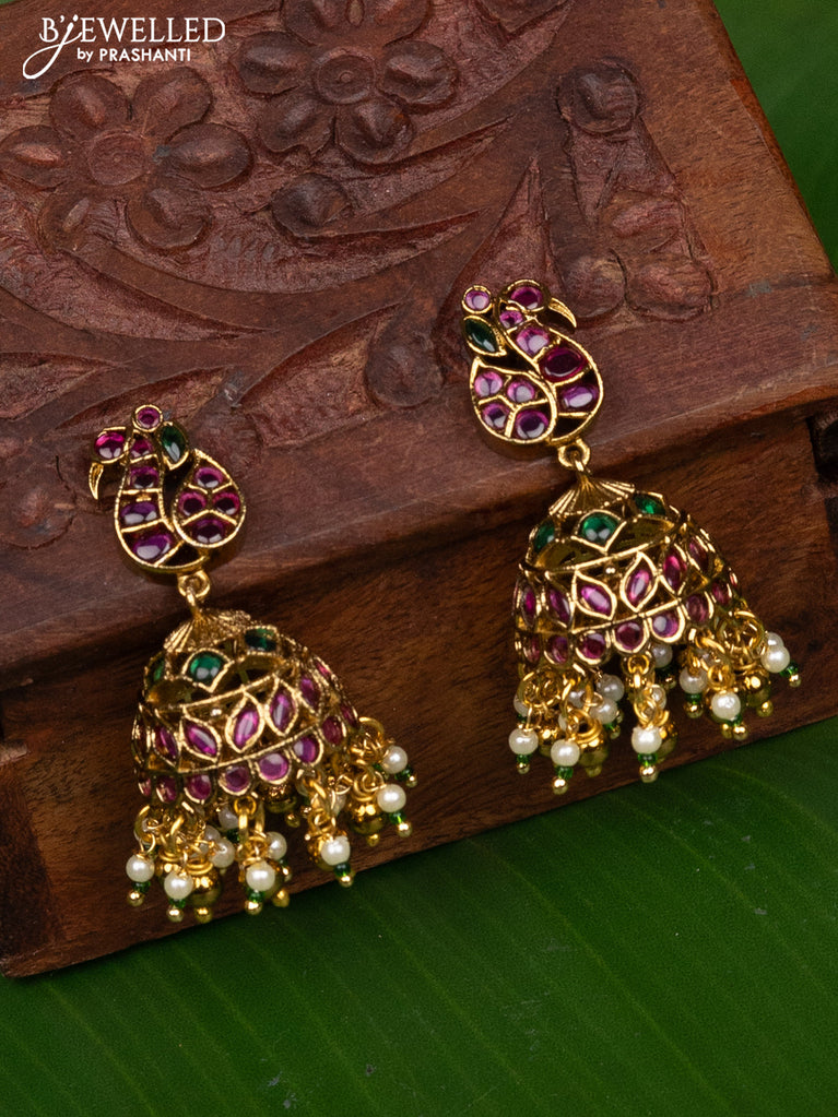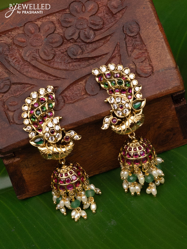 Antique medium size peacock design jhumka with kemp and pearl hangings
