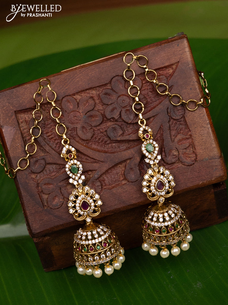 Antique medium size maatal type jhumka with kemp & cz stones and pearl hangings