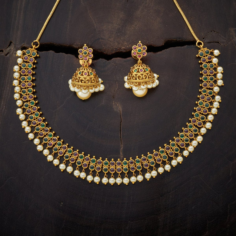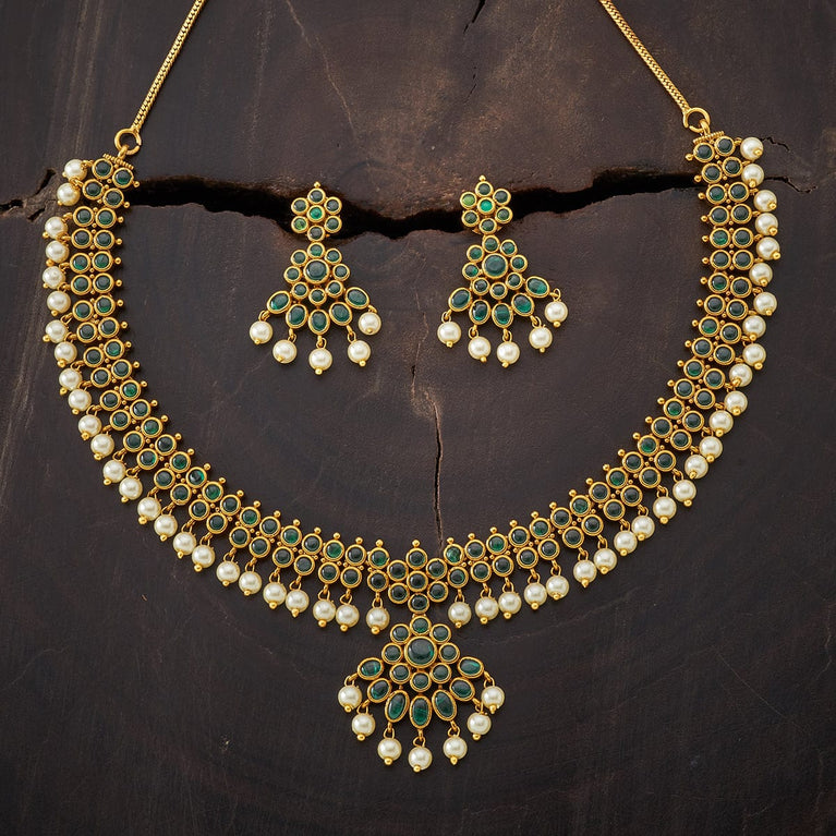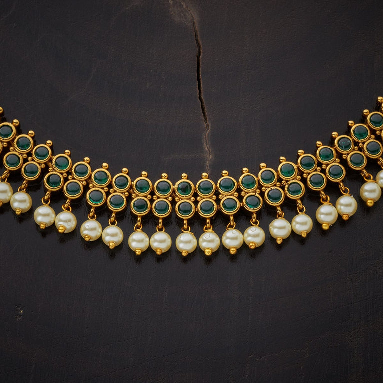 Kushal's Ruby & Green Necklace Set With Stones & Beads With a ravishing pattern on the short necklace and a pair of matching jhumka earrings, this jewellery set with an antique touch will make you the show-stopper wherever you go. Embellished with ruby and green stones set in a linear pattern and hanging beads, it is plated in gold. This necklace set has a distinctive charm and is perfect for wedding seasons.