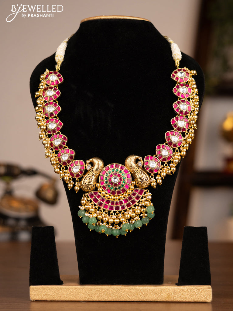 Antique necklace peacock design with jadau kundan stones and green & golden beads hanging without earrings