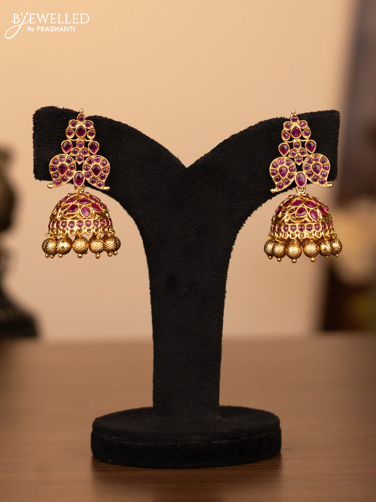 Antique necklace lakshmi kasu design with pink kemp stones and golden beads hangings