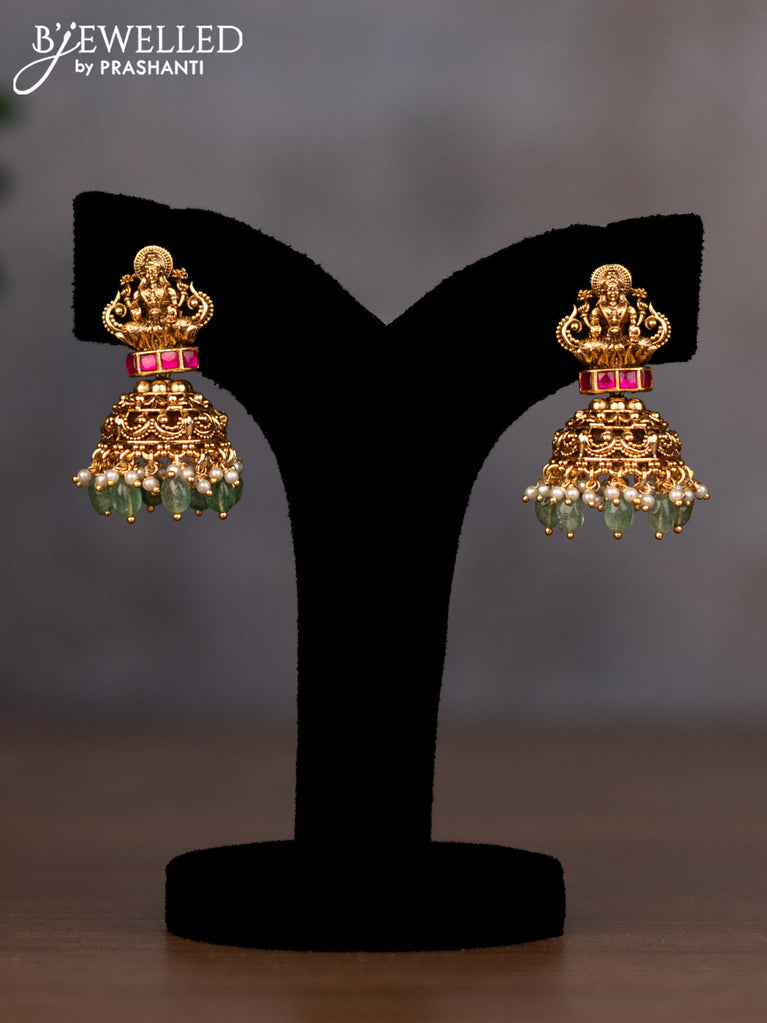 Antique necklace lakshmi pendant with green kemp stones and golden beads hanging