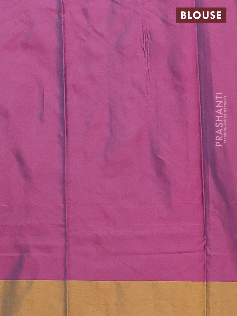Arani semi silk saree deep purple and green mustard yellow with plain body and temple design border